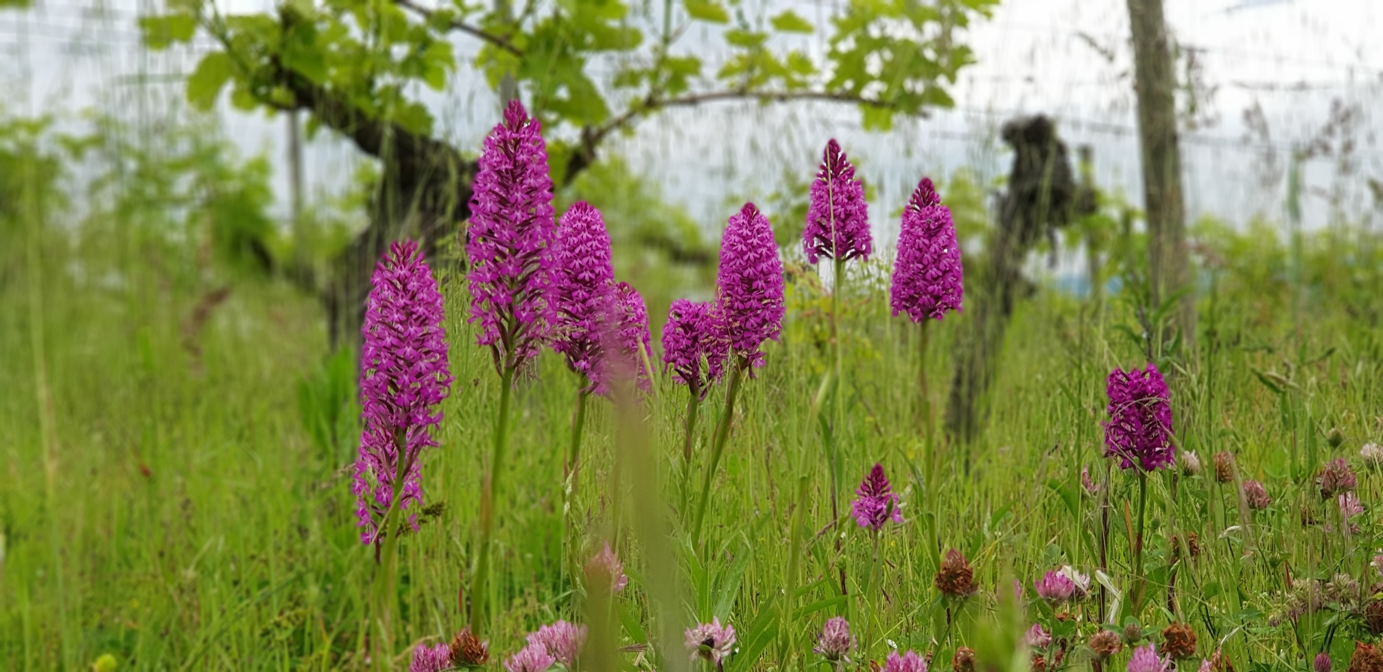 A Purple Pyramid orchid cosying up next to one of our old Sémillon vines (photo early May 2021).