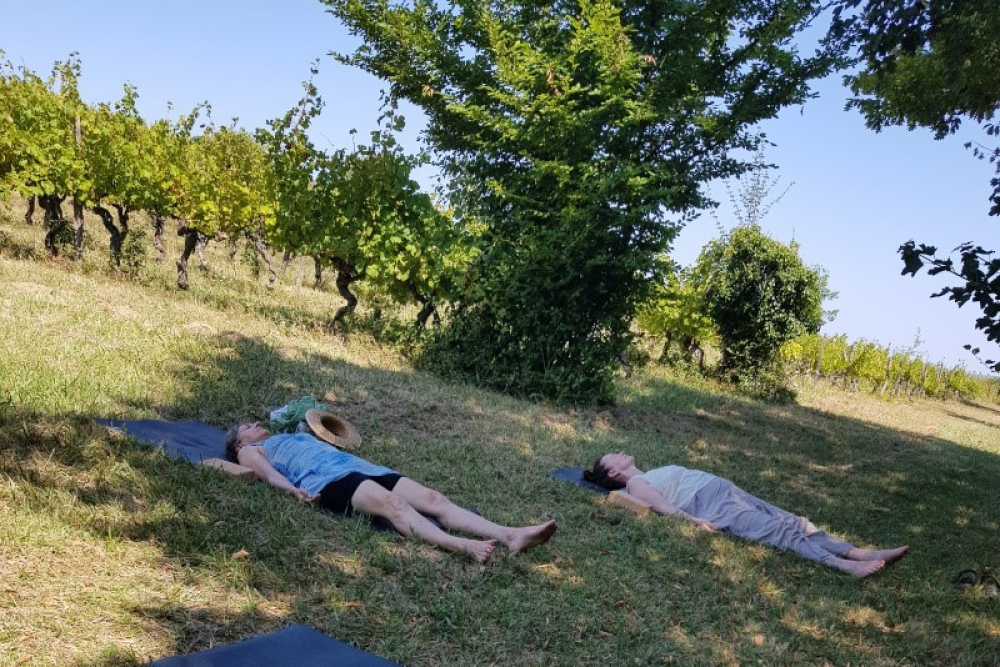 A unique yoga and mindful wine-tasting experience in the Dordogne, on an organic vineyard, in Saussignac, near Bergerac and Ste Foy La Grande